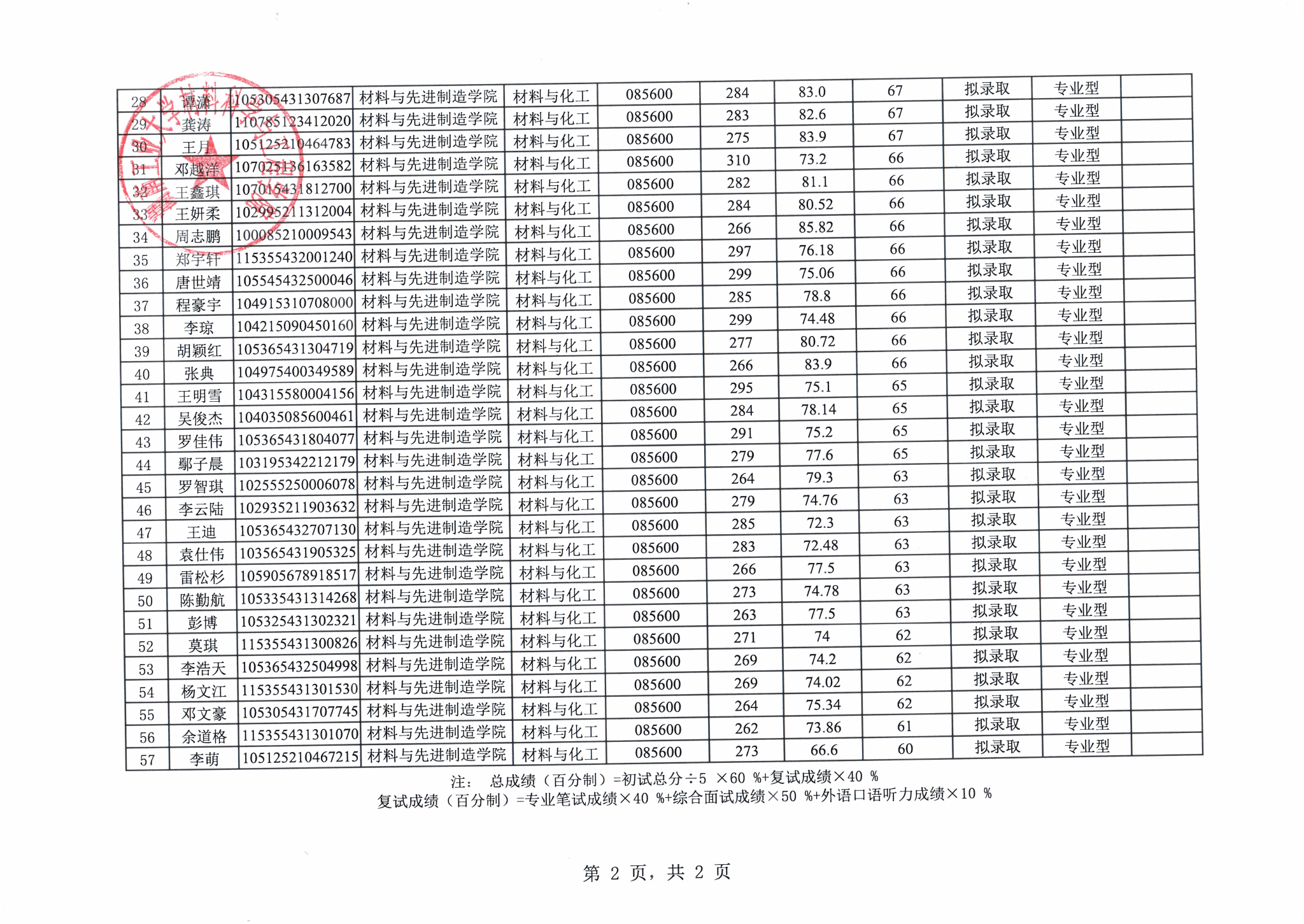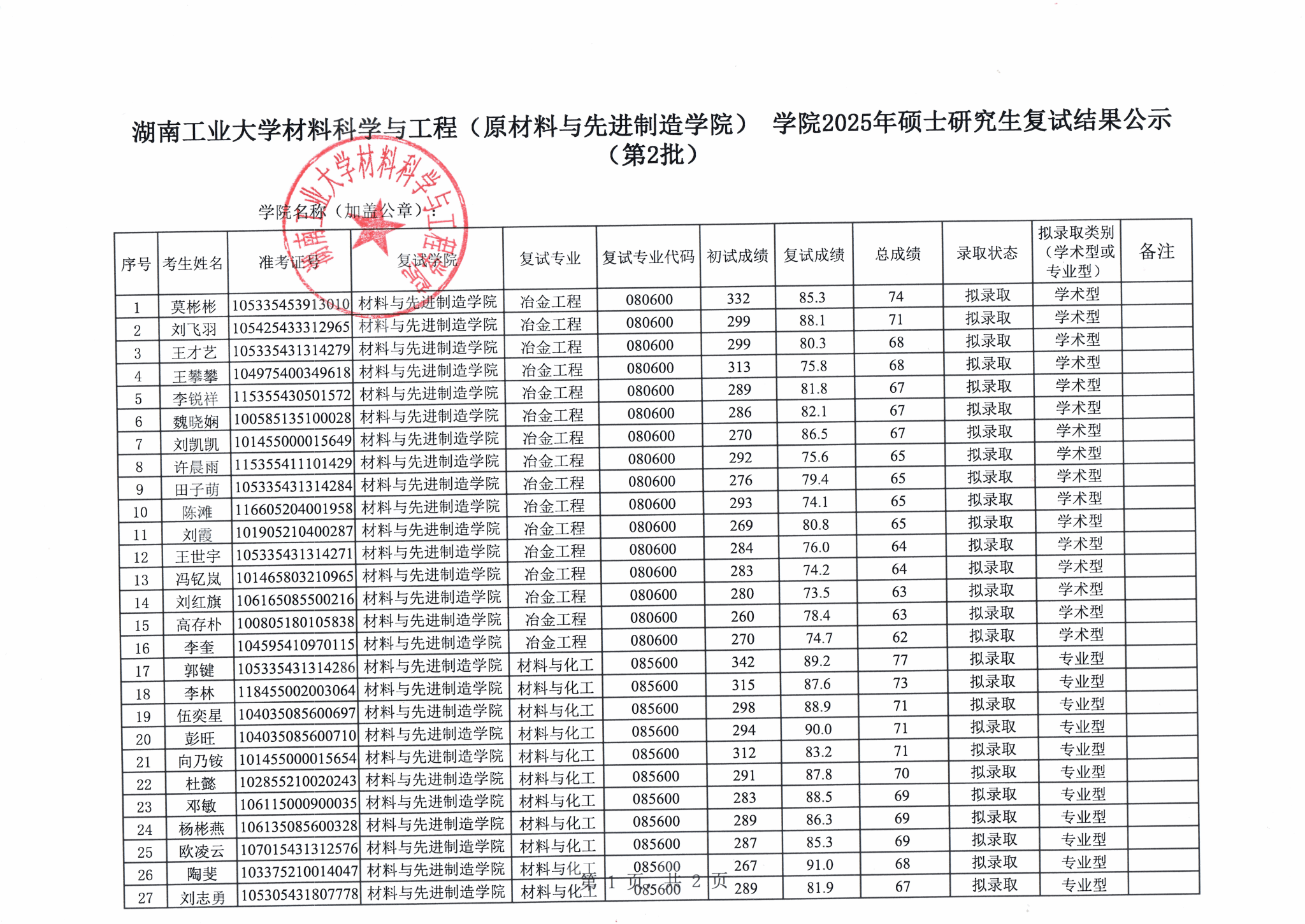 湖南工业大学材料与先进制造学院2025年硕士研究生复试结果公示(第一批)